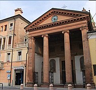 Fondata ai primi del Seicento, la chiesa presenta una facciata dal caratteristico vestibolo a colonne coronato da timpano di linee neoclassiche, costruito nel 1837 su progetto di Gusmano Soli, esponente di rilievo della cultura architettonica della Restaurazione austro-estense.